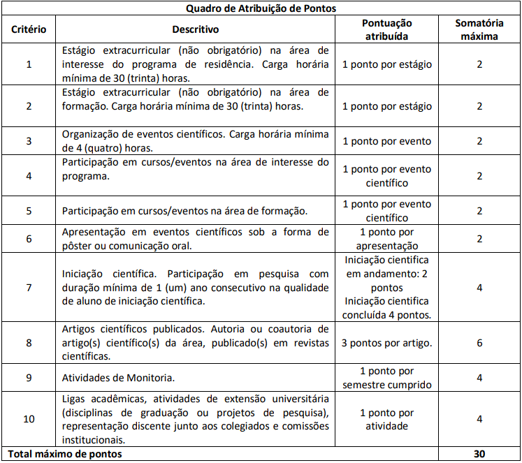 A análise curricular é de caráter meramente classificatório e terá a pontuação máxima igual à soma algébrica dos pontos obtidos pelos títulos apresentados, limitada a 30,0 pontos, ainda que a soma dos valores dos títulos apresentados seja superior a esse valor.