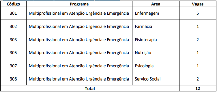 Descrição: atuar em equipes multiprofissionais na modalidade de urgência e emergência e desenvolver competências técnicas de intervenção relacionadas à assistência em saúde, à gerência, à educação e à pesquisa na área da saúde; atuar com competência em sua área profissional específica e em equipe multidisciplinar; inter-relacionar as várias áreas de atendimento como pronto atendimento, atenção primária, internação, reabilitação e seguimento ambulatorial a fim de atender as metas da integralidade e resolutividade da atenção em saúde no SUS.