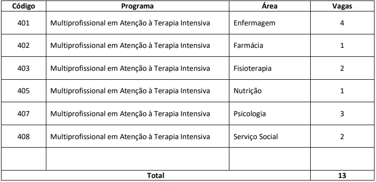 Descrição: atuar em equipe multiprofissional na assistência aos pacientes em U.T.I. adulto e desenvolver competências técnicas de intervenção relacionadas à assistência em saúde, à gerência, à educação e à pesquisa na área da saúde; atuar com competência em sua área profissional específica e em equipe multidisciplinar; inter-relacionar as várias áreas de atendimento como pronto socorro, pronto atendimento, atenção primária, internação, reabilitação e seguimento ambulatorial a fim de atender as metas da integralidade e resolutividade da atenção em saúde no SUS.